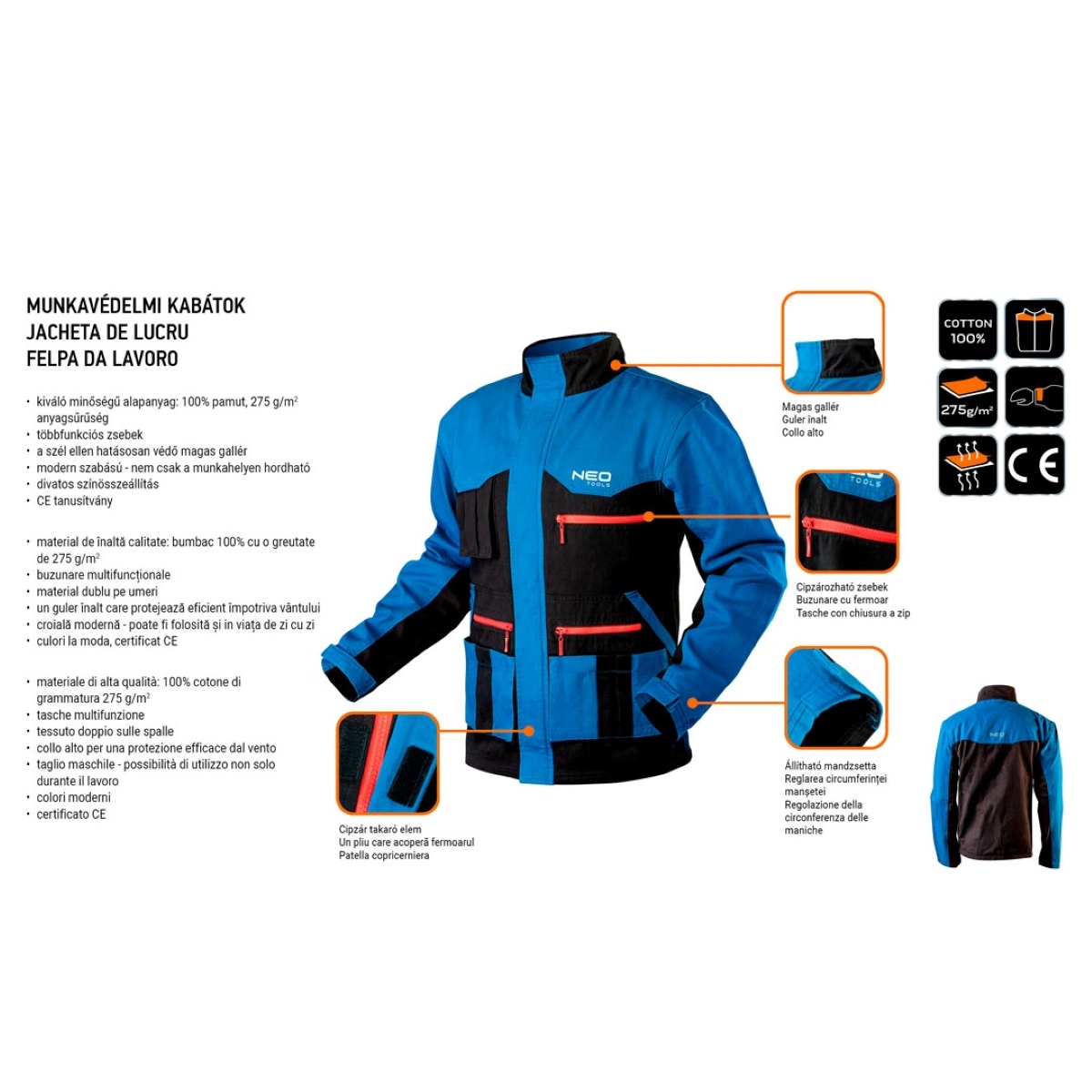NEO munkapilóver, HD+ termékcsalád, kiváló minőségű pamut-poliészter szövetből készül. A pulóver a speciális kialakításának, szabályozható ujjvégnek és magas gallérnak köszönhetően biztosítja a kényelmes használatot. A termék cipzáros, multifunkciós, valamint patentzáras zsebekkel rendelkezik. A dupla anyag a vállban ellenáll a mechanikai sérüléseknek. A felsőt kiemeli a színek bátor összeállítása és a modern szabása lehető teszi a termék munka utáni viselését. A CE európai tanúsítványa garantálja minőségét. A NEO márka a professzionális igényeket is kielégíti.