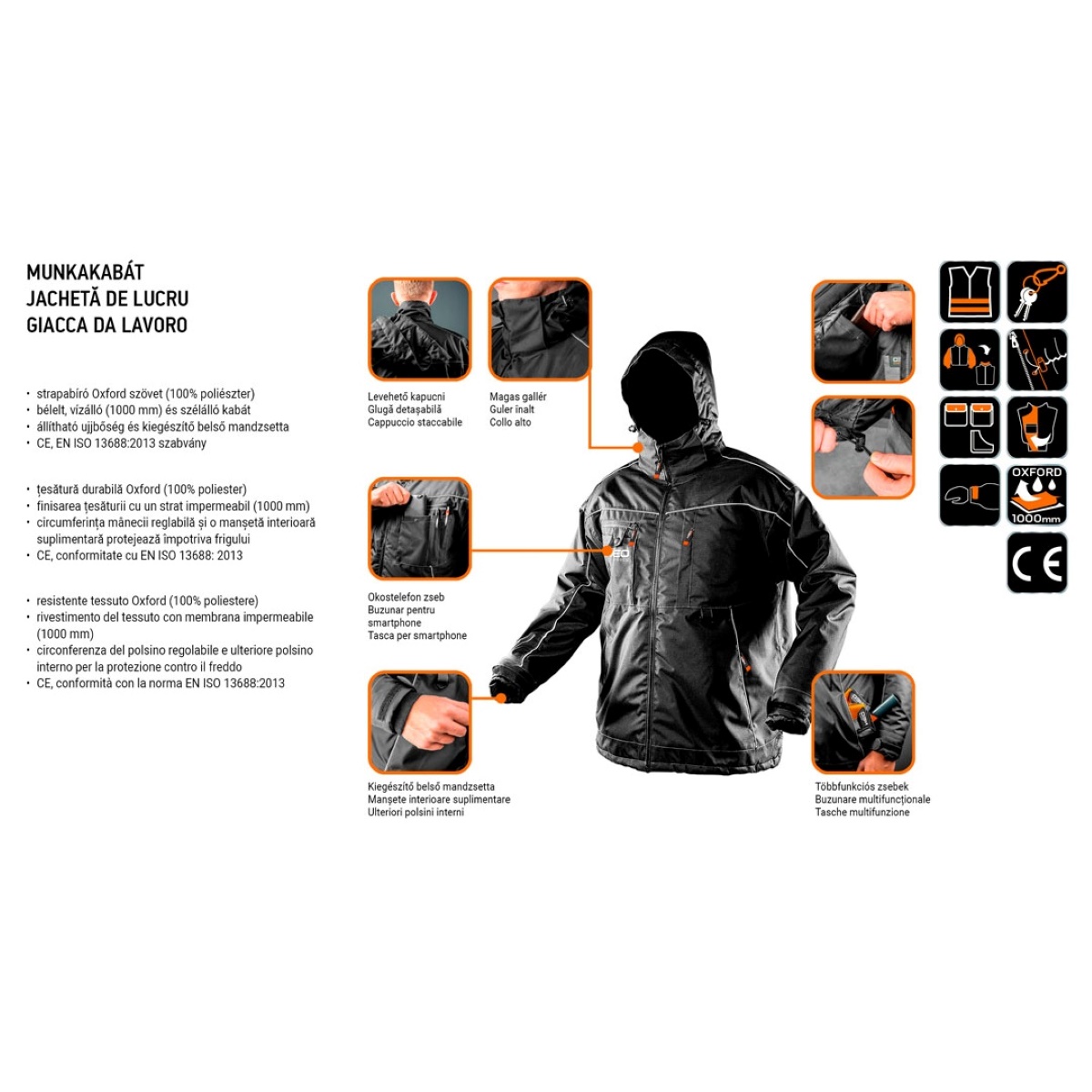 NEO téli munkaruha dzseki vízlepergető és szélálló. Nagyon meleg, de az alkalmazott anyagoknak köszönhetően könnyű és strapabíró. Nem akadályozza vizelője mozgását. Levehető szabályozható csuklyával és magas, a nyakat védő állógallérral. Az ujjak szabályozható rugalmas kézelőkkel, valamint második, a szél és az eső ellen védő belső mandzsettával. A dzseki alsó szegélyvarrásába integrált, szabályozható rugalmas derékkal segíti a meleg megőrzését, maximálisan komfortossá téve a viseletét. Sok hasznos zsebbel, külön, a korábbiakhoz képest nagyobb zsebbel az okostelefonnak. A belső zsebnek és a többfunkciós akasztónak köszönhetően a szükséges dolgokat viselője mindig magánál tarthatja. A fényvisszaverő elemek biztosítják viselője láthatóságát. A termék EN ISO 13688:2013 szabvány szerinti kivitelezése és az európai CE tanúsítványa minőségének garanciája.