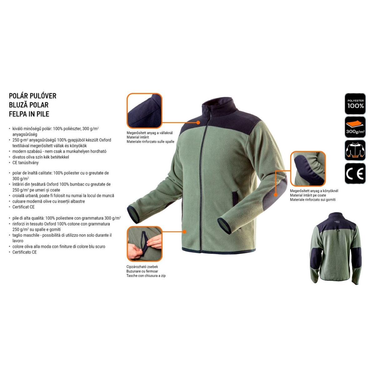 NEO Polár munkapulóver, CAMO termékcsalád, könnyű és kényelmes termék,300g/m2 grammatúrájú polárból. A termék a pliszé alatt elrejtett zipzározható zsebbel rendelkezik. Megerősített Oxford pamut anyag vállban és könyökben, mely jobban ellenáll a mechanikai sérüléseknek. Városias szabása és divatos színe lehető teszi a termék munka utáni viselését. A CE európai tanúsítványa garantálja minőségét.
