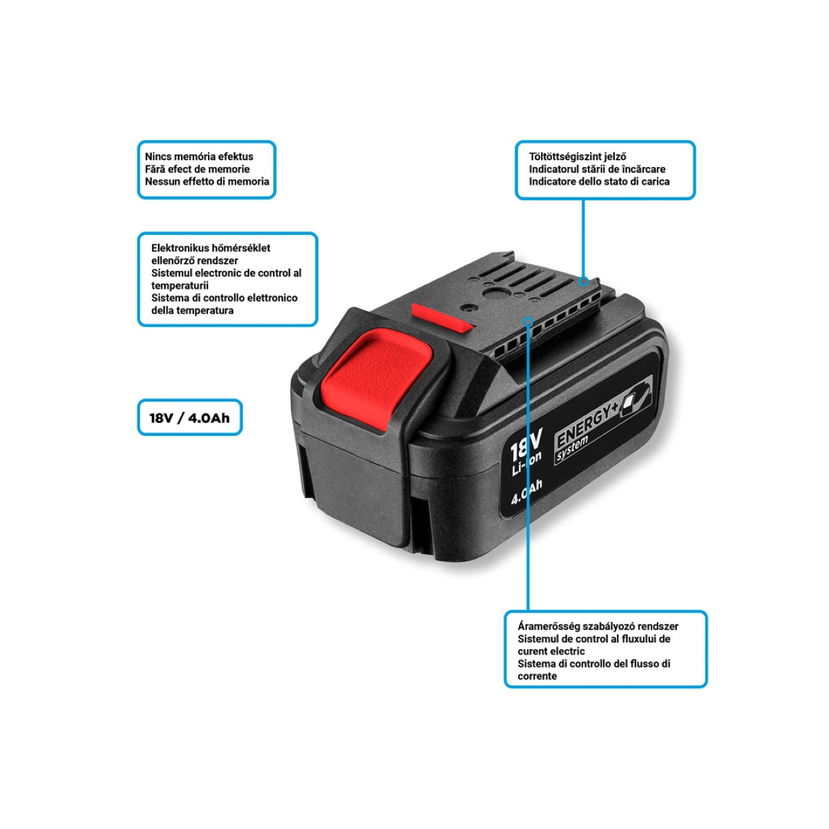 GRAPHITE Energy+ 18V, Li-Ion 4.0Ah kapacitású akkumulátor Rátölthető a kapacitás elvesztésének kockázata nélkül. Töltési mutatóval, valamint a feltöltés és lemerítés során a hőmérséklet és az áramerősséget figyelő rendszerrel rendelkezik. Megnövelt kapacitású akkumulátor a legigényesebb felhasználók számára, még hosszabb munkavégzési lehetőséget biztosít egy feltöltésből.